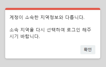 대구 이학습터로 들어가보았는데 계정이 소속한 지역정보와 다릅니다. 소속 지역을 다시 선택하여 로그인 해주시기 바랍니다. 라는 문구가 나왔습니다. 소속되어 있는 지역을 선택하여야 로그인하여 이용할 수 있습니다.