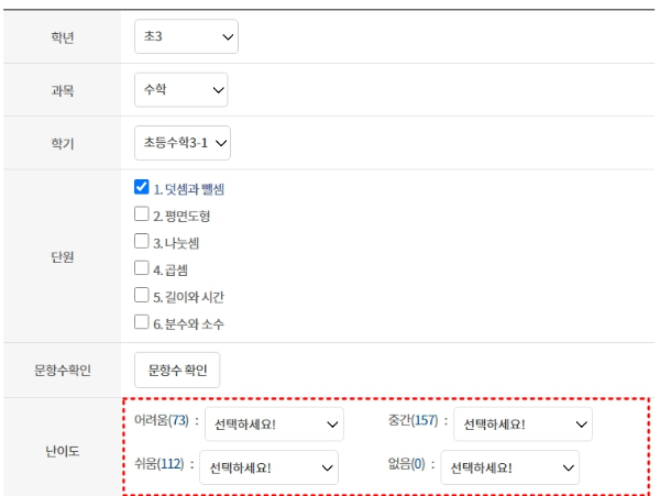 초등학교 3학년 수학과목을 선택해봤습니다. 1단원부터 6단원까지 어려움, 중간, 쉬움의 난이도에 따라 문제를 선택하여 자녀에게 풀이를 할 수 있도록 문항 갯수도 선택할 수 있습니다.
