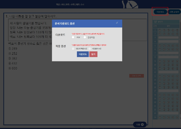3학년 1학기 수학 덧셈과 뺄셈 20문항을 선택해봤습니다. PC화면에서 바로 풀 수도 있고 PDF로 다운받을 수 있습니다. 정답과 해설도 다운받아서 볼 수 있는 옵션이 있으니 편한 방법으로 다운받으면 됩니다.