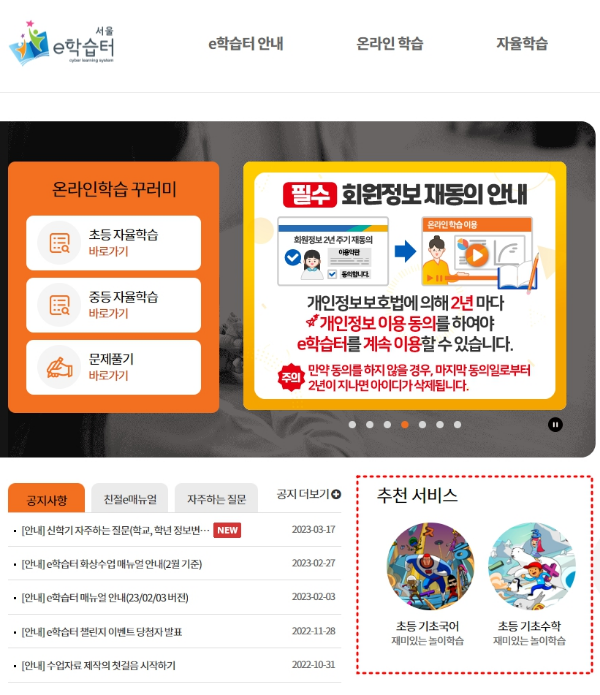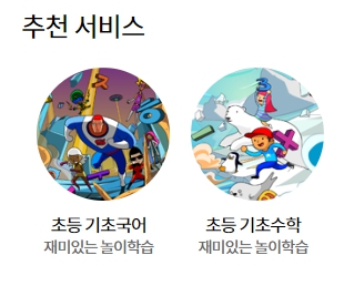 이학습터 메인 페이지 오른쪽 하단에 추천서비스를 보실 수 있습니다. 초등 기초 국어, 초등 기초 수학이 있으며 초등학교 1학년, 2학년 아이들이 공부에 흥미를 가질 수 있도록 게임으로 구성되어있습니다. 문제가 어렵지 않고 기초과정에서 흥미유발하기에도 괜찮아 보입니다. 7세 아이들이 학교가기 전에 준비과정으로 재미있는 놀이학습이 될 수 있을 것 같습니다.